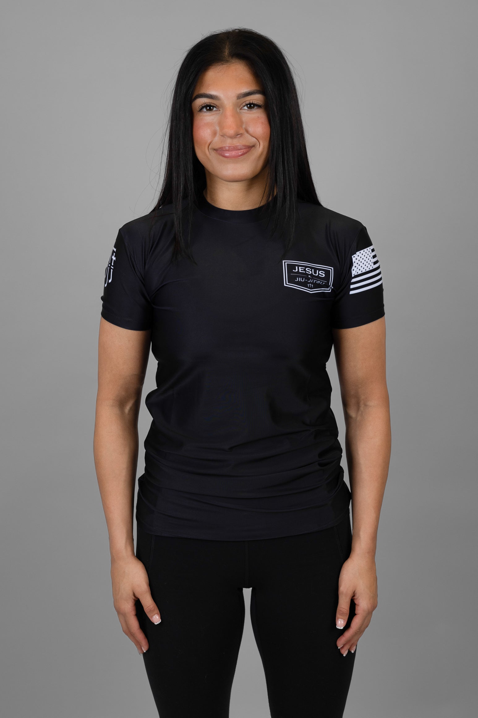Featuring the JJJ logo on the left chest, commanding prayer hands across the back, and sleeves adorned with the American flag and triple cross emblem, this piece merges faith and function seamlessly.