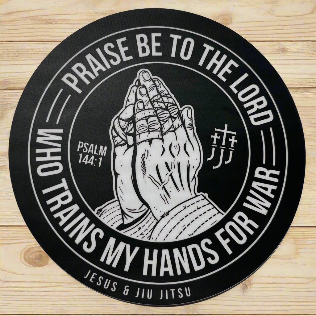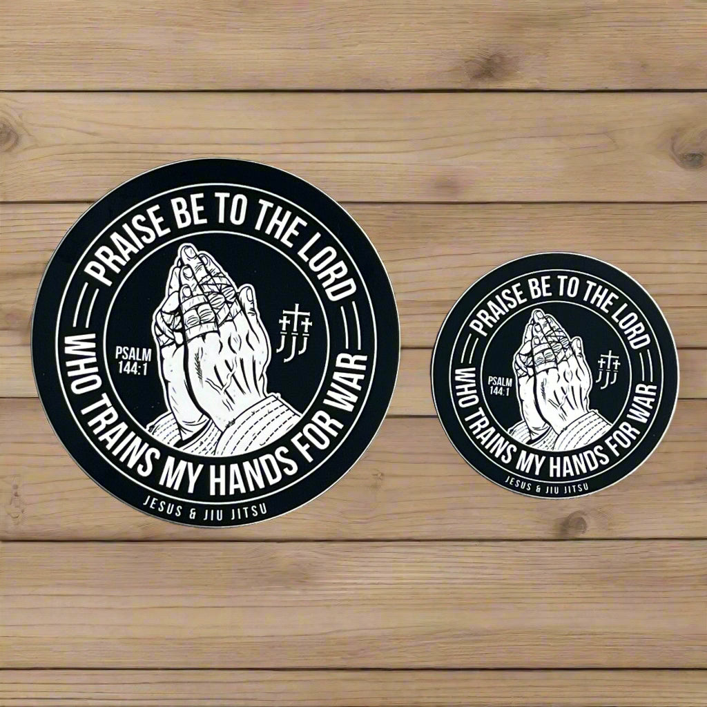 Our durable vinyl sticker features a size of 4", making it perfect for any surface. The design includes prayer hands, serving as a reminder to pray and prepare for spiritual battles, inspired by Psalm 144:1. Show your faith and stay strong with this high-quality sticker.
